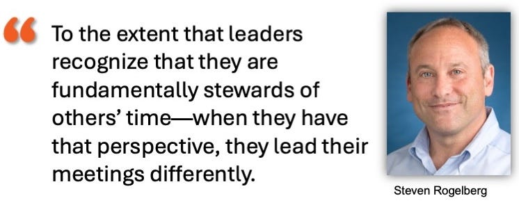 Rogelberg: To the extent that leaders recognize that they are fundamentally stewards of others’ time—when they have that perspective, they lead their meetings differently. They think more carefully about who needs to be there. They think more carefully about what truly needs to be discussed and in how much time. When you have that mindset and you facilitate the meeting, you’re not just about featuring your own voice, but you are facilitating the experience so that it’s truly a valuable one. So, that steward mindset is key.