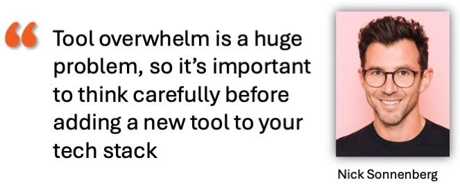 “Tool overwhelm is a huge problem, so it’s important to think carefully before adding a new tool to your tech stack,” Sonnenberg says. Adding something that isn’t necessary could cause more problems than you had to begin with.