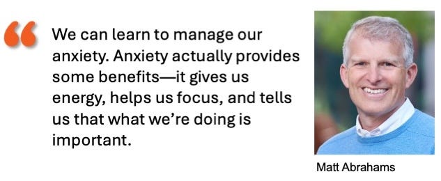 He encourages people he’s coaching to create “an anxiety management plan.” This is three to five techniques that people can use to help manage their specific symptoms and sources. “For example, someone might benefit from deep belly breaths that slows down the autonomic nervous system, reduces the heart rate and slows rapid breathing. They might also include a self-affirmation like ‘I have value to bring’ that serves to cancel out negative self-talk that many of us have. Finally, they can work to be present-oriented to cancel out fear of not achieving their future goals by listening to a song, doing something physical, or even saying a tongue twister.”