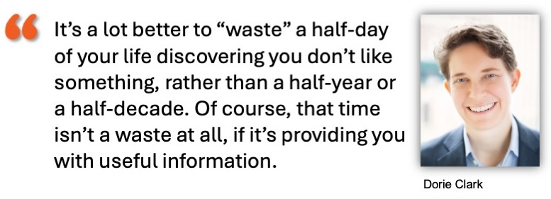 Duncan: You recommend “test driving” a new career direction to ensure it’s really a good fit. How can that be done in a way that avoids a risky detour?