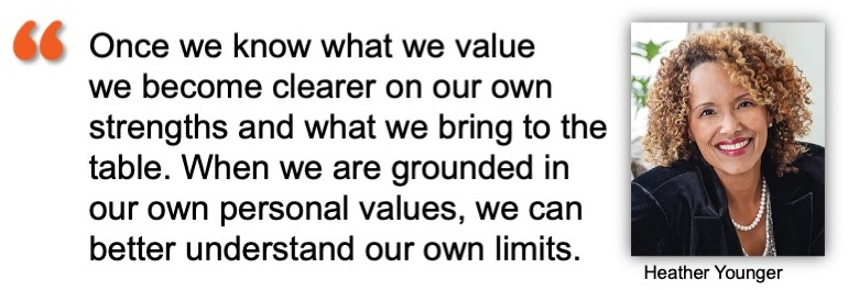 “Once we know what we value we become clearer on our own strengths and what we bring to the table,” she says. “I can speak more impactfully to people I look to influence when I understand how my personal values can contribute to special projects or challenges. When we are grounded in our own personal values, we can better understand our own limits.”